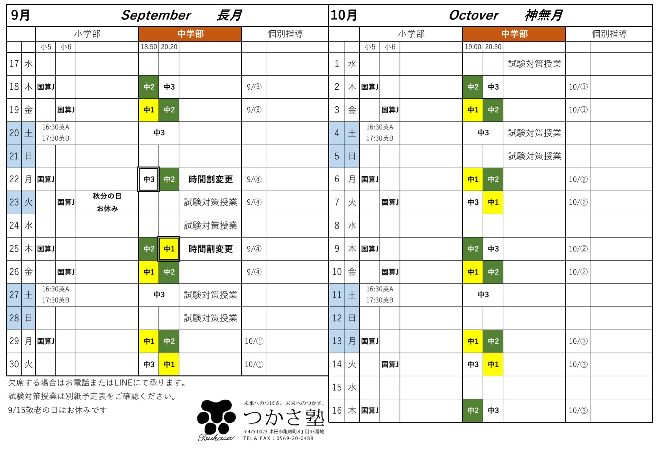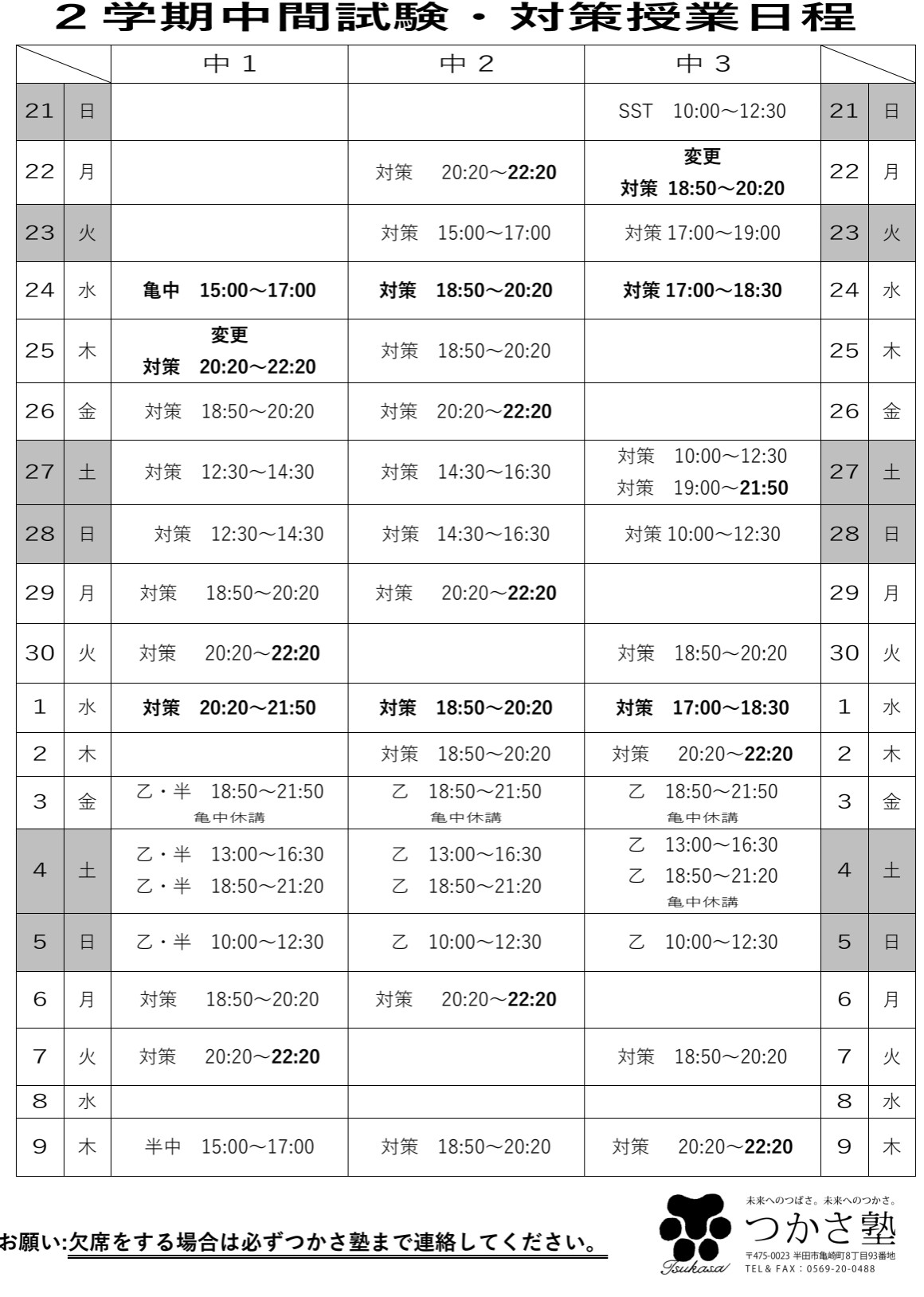中学生は時間割の入れ替えや、試験対策で不規則な時間帯になることもありますので、予定表を確認の上通塾してください。